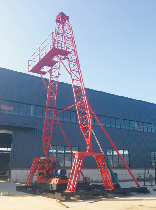 AY-13型鉆塔可配套各種水井鉆機和XY系列巖芯鉆機直、斜孔的施工。其特點為設(shè)計除具有承載能力較大、結(jié)構(gòu)合理、液壓起塔安全,拆裝、搬運成本低等特點外,顯著特點是一是塔腳跨度大(5米),操作鉆機空間大;二是塔身下塔腿鏈接鉸鏈高于底座底梁2.3米,從而在鉆機左右擺放時下塔腿不影響鉆機前后移車,鉆機動力部分可移至塔腿支撐內(nèi)檔中。也使得斜孔鉆進(jìn)和提鉆過程中天車、回轉(zhuǎn)、井孔達(dá)到三點一線,大大提高了定向井孔施工的安全性。